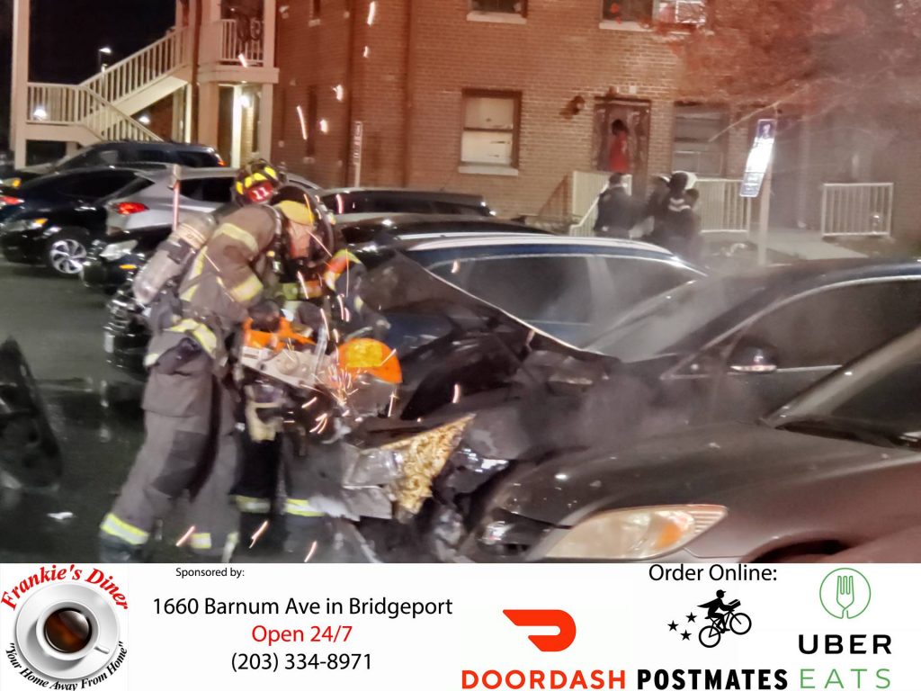 2020-11-16@10:47pm–#Brigeport CT– Tonight’s vehicle fire was hosted by Bridgeport at PT Barnum Housing near building 2. Firefighters quick response kept the fire confined to the one car. In the picture firefighters work to get the hood open to make sure the fire is completely out and to secure the power from the battery.