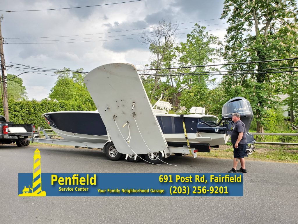 2021-05-23@3:08pm– #Southport CT– #Fairfield CT– A boat being towed from Virginia to Rhode Island diverted off I-95 due to the earlier accident and struck the railroad overpass on Westway Road. The overpass was clearly marked to be ten feet in height.