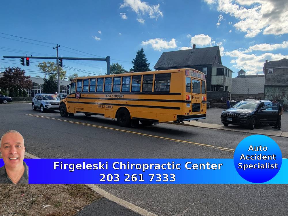 2022-09-27@3:34pm–#Fairfield CT– A minor accident between a Jeep SUV and a school bus at the intersection of Brentwood and Commerce Drive. There were no reported injuries but now you know why the bus was late!