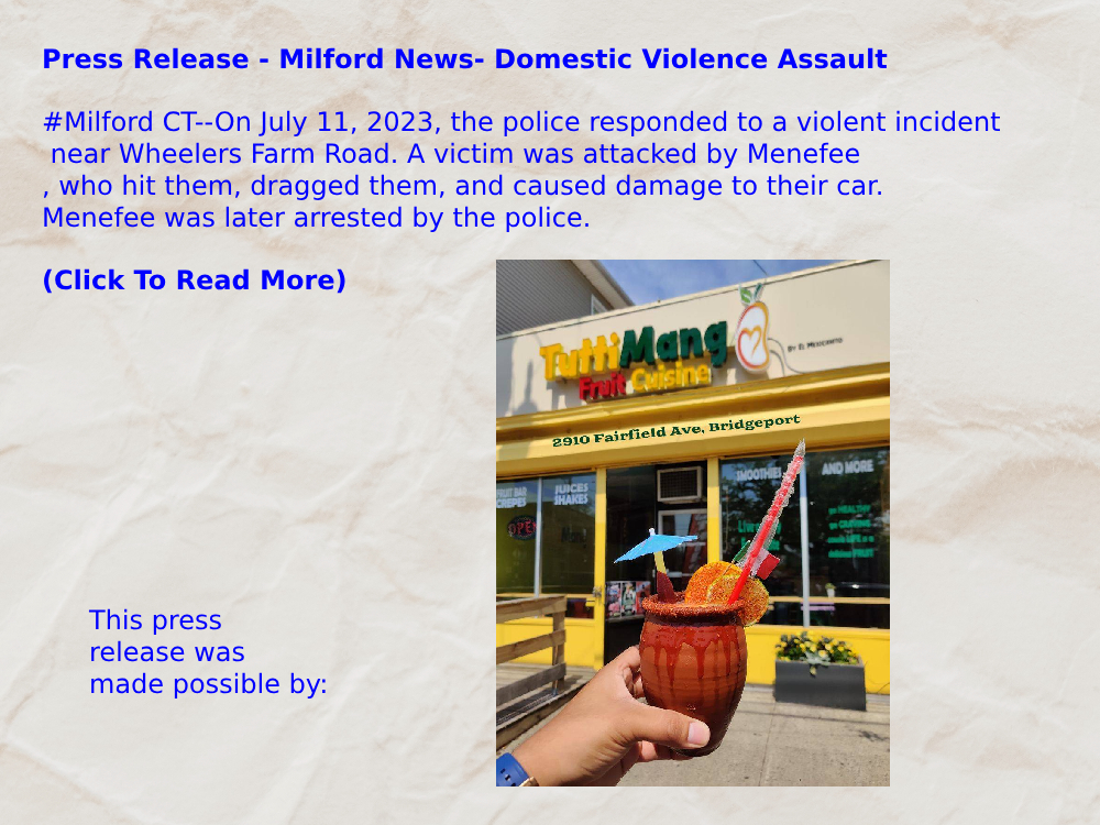 On July 11, 2023, officers responded to a domestic violence incident near Wheelers Farm Road. Upon arrival, an officer observed a vehicle flee at a high rate of speed. They spoke to the victim who was visibly shaken and upset, sitting in their vehicle. The victim had bruising to their face and an abrasion on their leg. The victim said