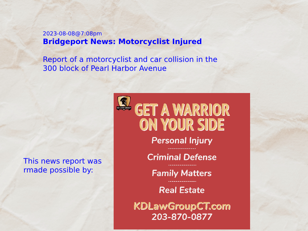 2023-08-08@7:08pm–#Bridgeport CT–Report of a motorcyclist and car collision in the 300 block of Pearl Harbor Avenue