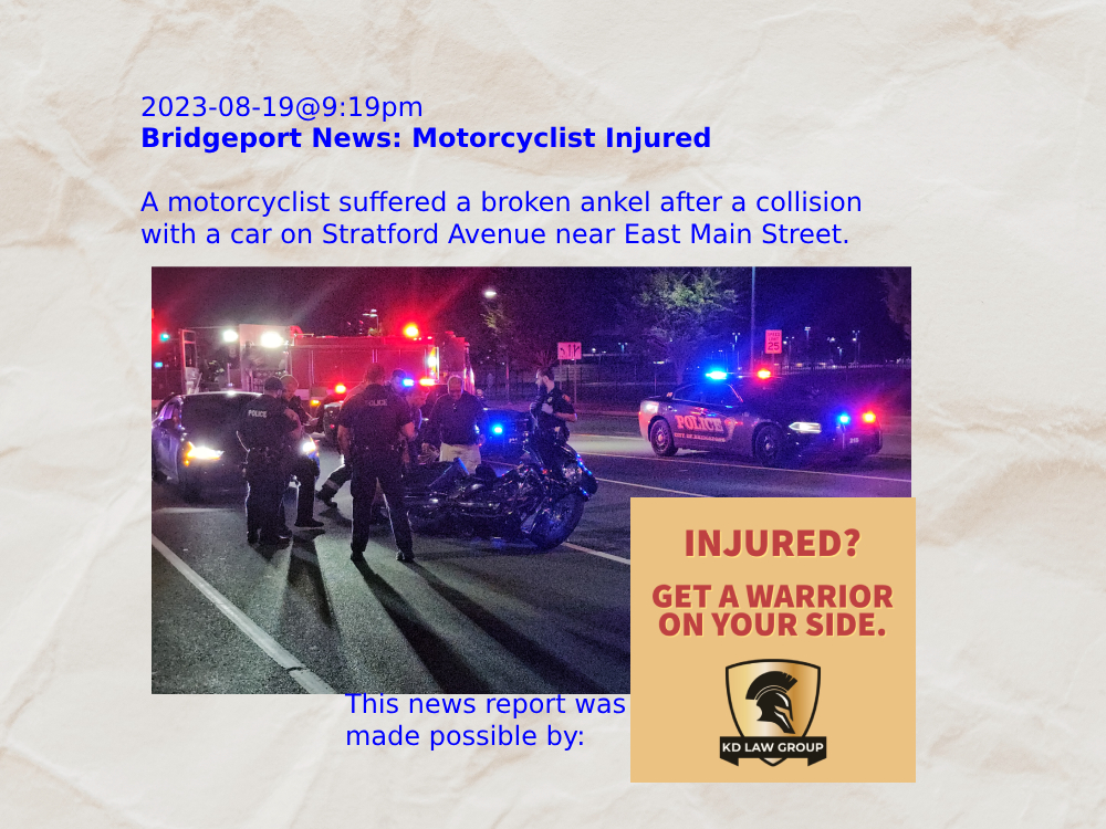2023-08-19@7:00pm A motorcyclist suffered a broken ankle after a collision