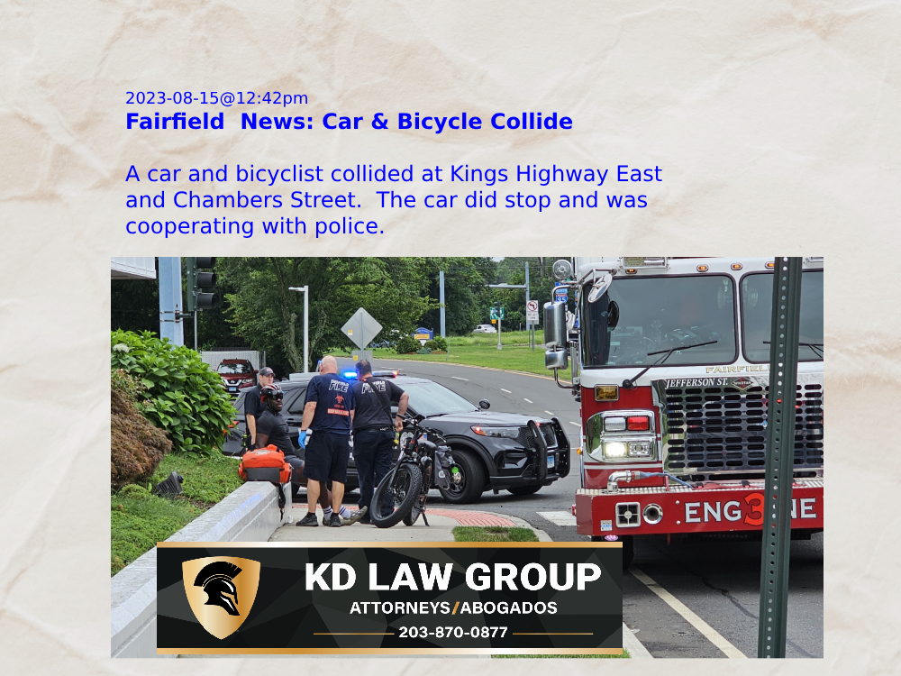 A car and bicyclist collided at Kings Highway East and Chambers Street. The car did stop and was cooperating with the police.