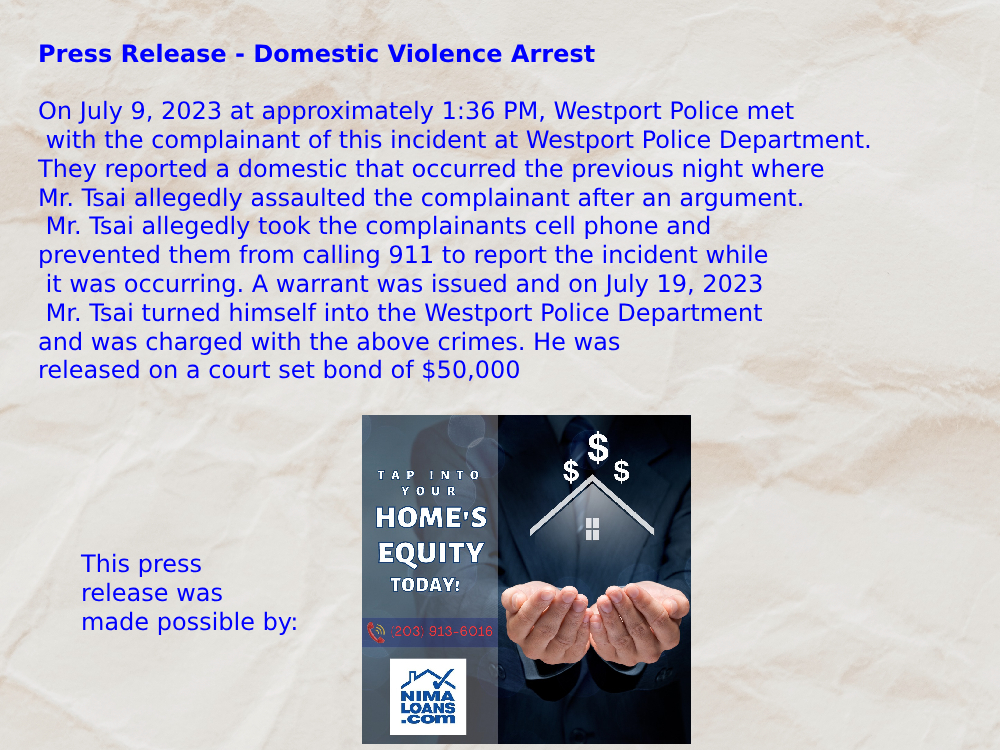 Mr. Tsai allegedly took the complainants cell phone and prevented them from calling 911 to report the incident while it was occurring. A warrant was issued and on July 19, 2023, Mr. Tsai turned himself into the Westport Police Department and was charged with Disorderly Conduct, Interfering with an Emergency Call, and Assault 3rd