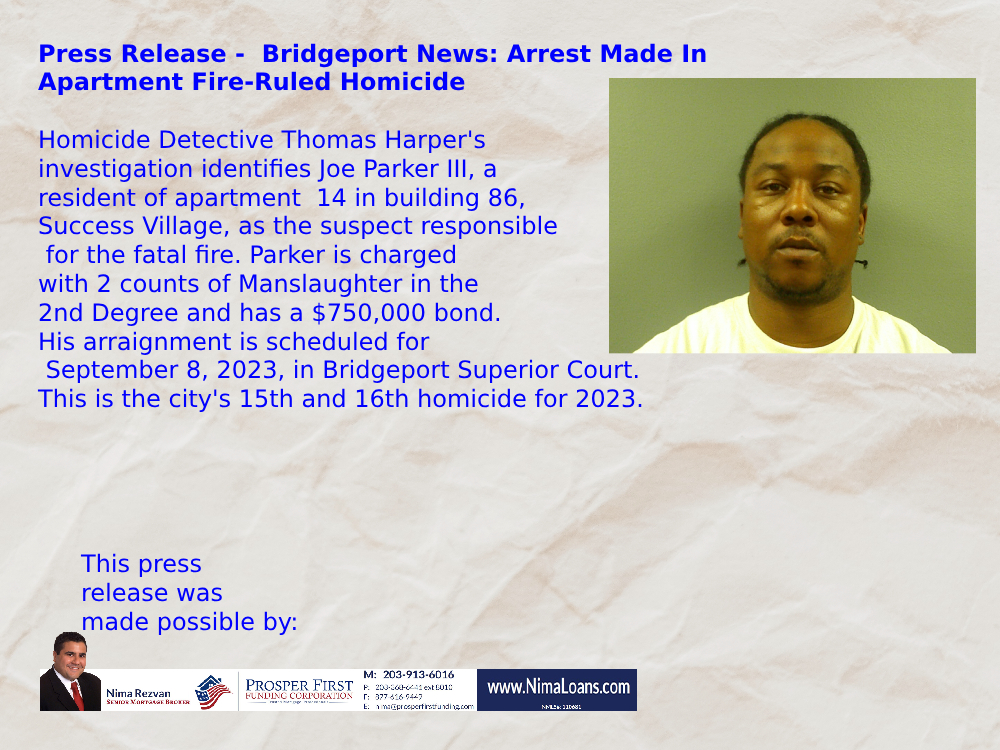 #Bridgeport CT–Homicide Detective Thomas Harper’s investigation identifies Joe Parker III, a resident of apartment 14 in building 86, Success Village, as the suspect responsible for the fatal fire. Parker is charged with 2 counts of Manslaughter in the 2nd Degree and has a $750,000 bond. His arraignment is scheduled for September 8, 2023, in Bridgeport Superior Court.