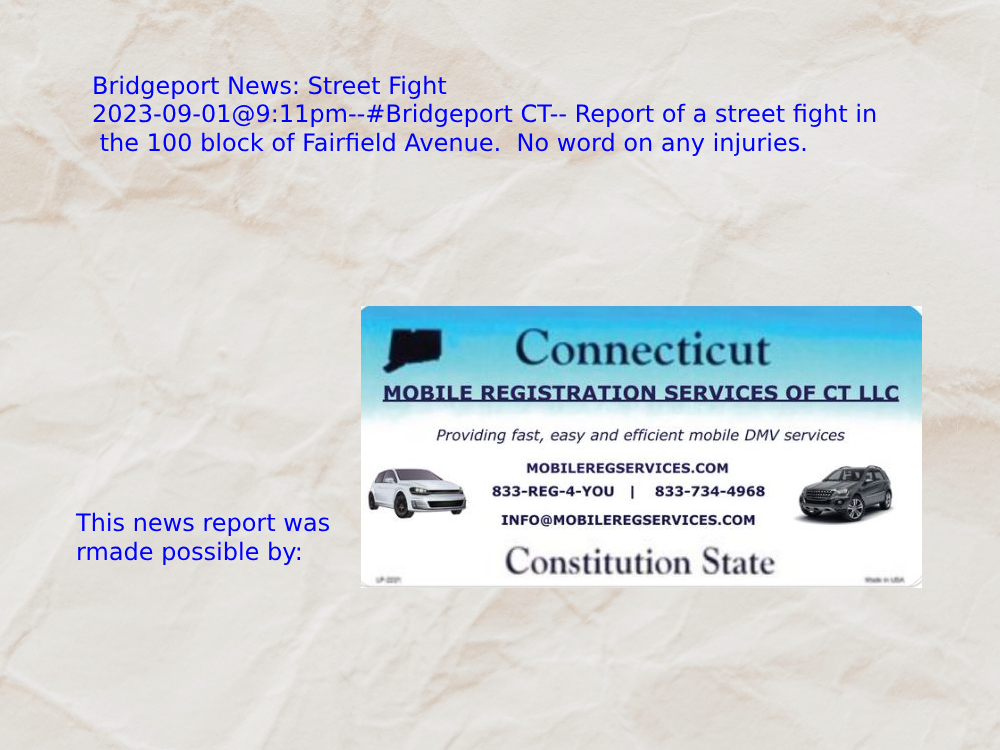 2023-09-01@9:11pm–#Bridgeport CT– Report of a street fight in the 100 block of Fairfield Avenue. No word on any injuries.