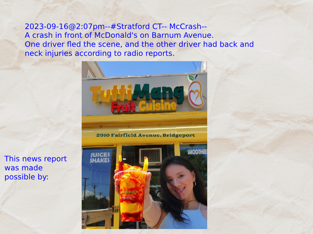 2023-09-16@2:07pm–#Stratford CT– McCrash–A crash in front of McDonald’s on Barnum Avenue. One driver fled the scene, and the other driver had back and neck injuries according to radio reports.