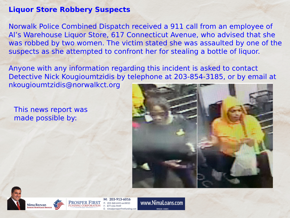 On October 11, 2023, at 7:37 PM, Norwalk Police Combined Dispatch received a 911 call from an employee of Al’s Warehouse Liquor Store, 617 Connecticut Avenue, who advised that she was robbed by two women. The victim stated she was assaulted by one of the suspects as she attempted to confront her for stealing a bottle of liquor. The victim declined medical treatment.