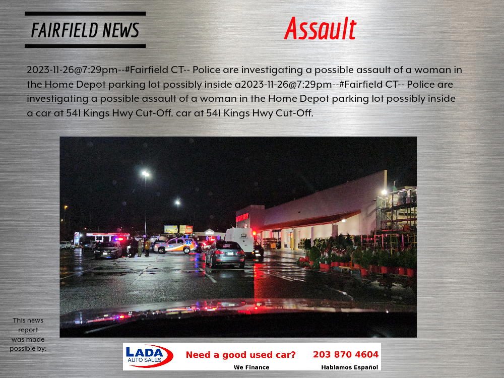 2023-11-26@7:29pm–#Fairfield CT– Police are investigating a possible assault of a woman in the Home Depot parking lot possibly inside a2023-11-26@7:29pm–#Fairfield CT– Police are investigating a possible assault of a woman in the Home Depot parking lot possibly inside a car at 541 Kings Hwy Cut-Off. car at 541 Kings Hwy Cut-Off.