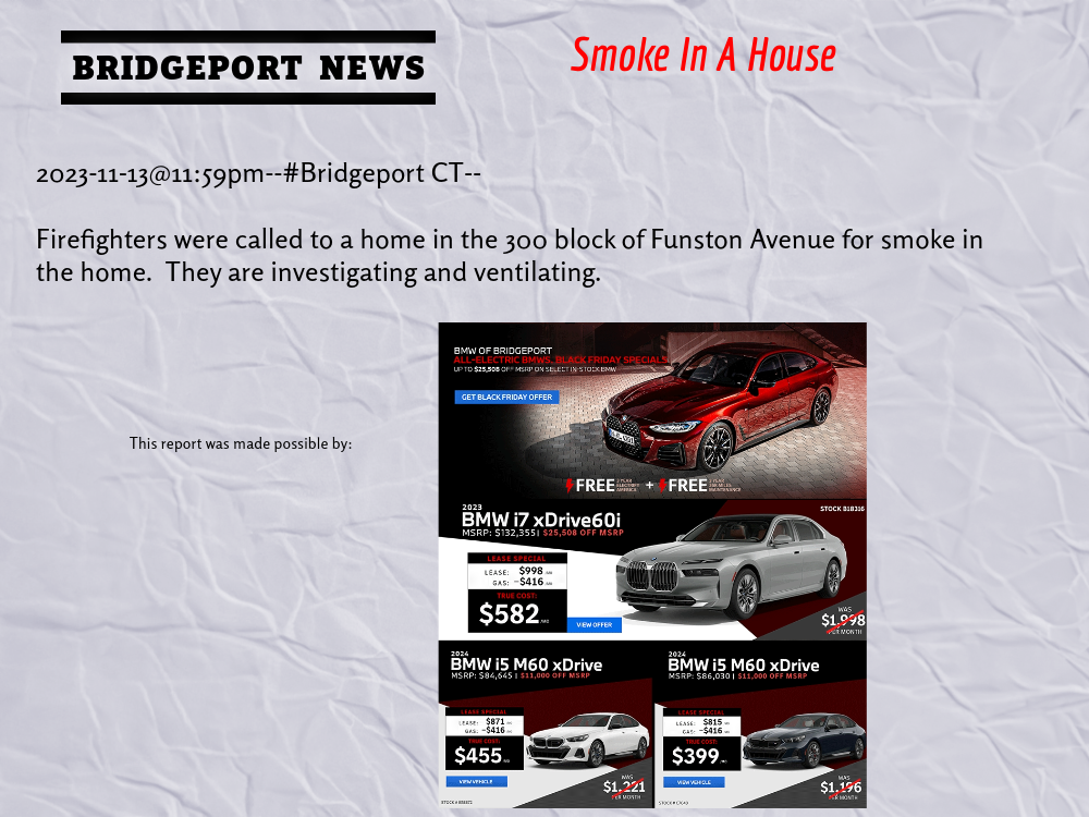 2023-11-13@11:59pm–#Bridgeport CT– Firefighters were called to a home in the 300 block of Funston Avenue for smoke in the home. They are investigating and ventilating.