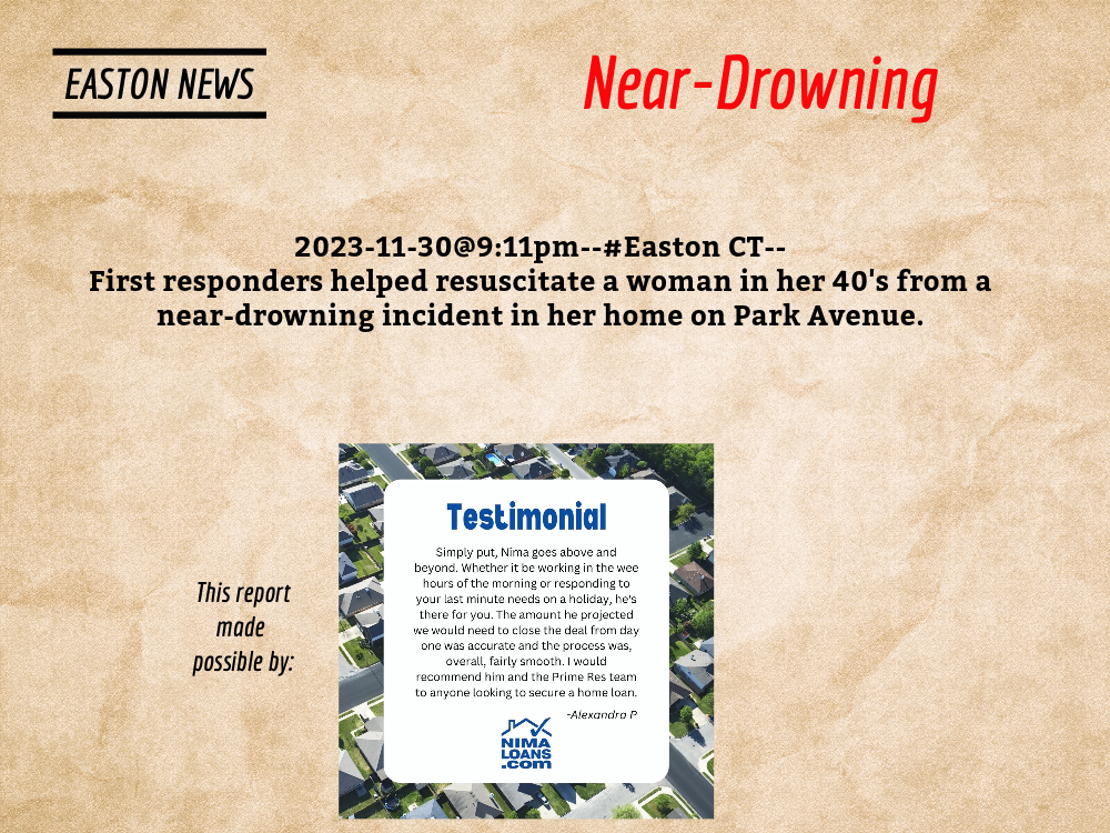 2023-11-30@9:11pm–#Easton CT– First responders helped resuscitate a woman in her 40s from a near-drowning incident in her home on Park Avenue (in Easton).