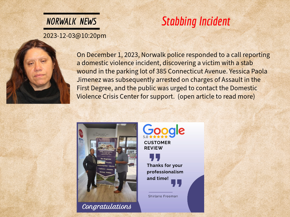 The victim was transported to Norwalk Hospital via ambulance for treatment, while officers initiated a search for the suspect. Subsequently, Norwalk Police Detectives took over the investigation, leading to the arrest of the suspect, Yessica Paola Jimenez.