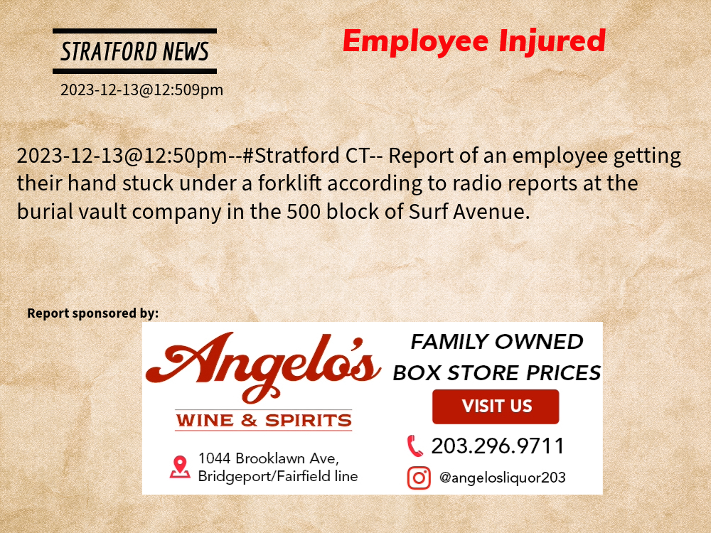 2023-12-13@12:50pm–#Stratford CT– Report of an employee getting their hand stuck under a forklift according to radio reports at the burial vault company in the 500 block of Surf Avenue.