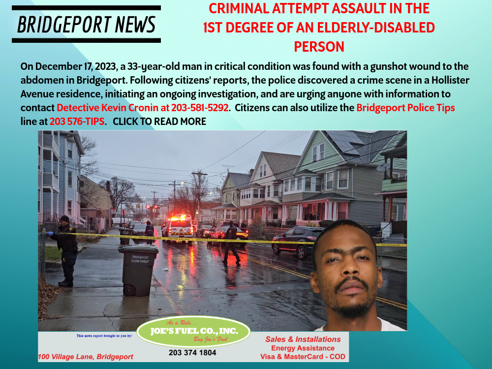 On December 17, 2023, around 12:40 pm, the Bridgeport Police Emergency Operations Center (EOC) received a report about an individual who had arrived at a local hospital with a gunshot wound to the abdomen. The victim was later identified as a 33-year-old man from Bridgeport, with previous addresses linking him to Stratford, CT. He is currently in critical condition.