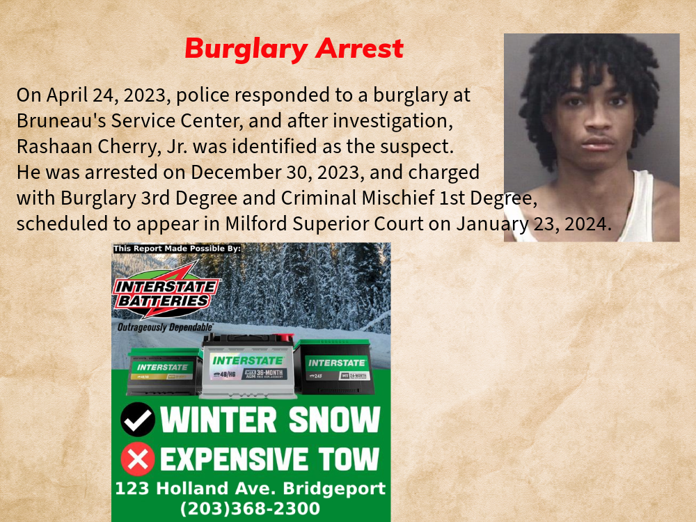 On December 30, 2023, the Bridgeport Police Department took Cherry into custody and handed him over to the Milford Police Department for the arrest warrant. Rashaan Cherry, Jr., who is 18 and lives on Evelyn Street, Stratford, was charged with Burglary 3rd Degree and Criminal Mischief 1st Degree. He was let go with a Promise to Appear and is set to go to court in Milford on January 23, 2024.