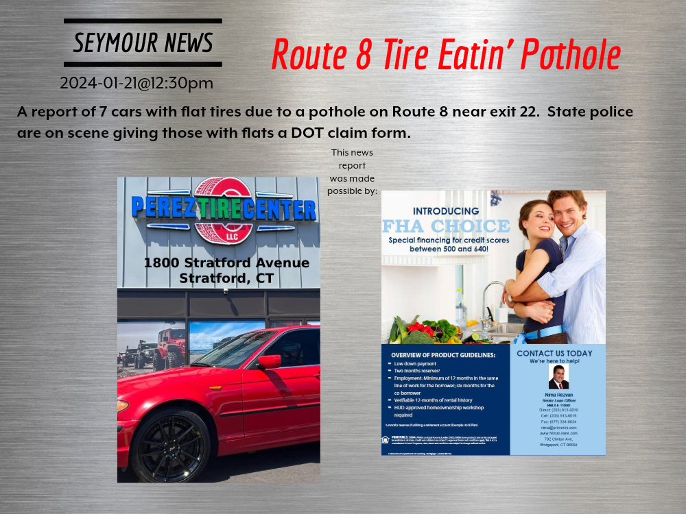 2024-01-21@12:30pm–#Seymour CT– A report of 7 cars with flat tires due to a pothole on Route 8 near exit 22. State police are on the scene giving those with flats a DOT claim form.