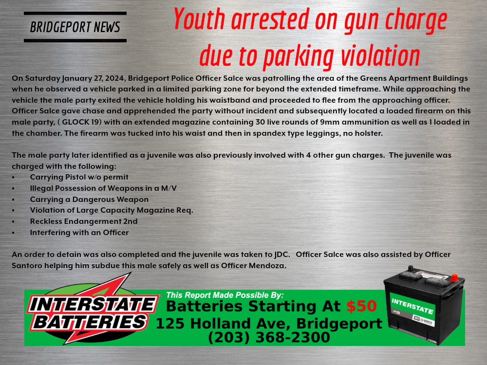 On Saturday January 27, 2024, Bridgeport Police Officer Salce was patrolling the area of the Greens Apartment Buildings when he observed a vehicle parked in a limited parking zone for beyond the extended timeframe. While approaching the vehicle the male party exited the vehicle holding his waistband and proceeded to flee from the approaching officer. Officer Salce gave chase and apprehended the party without incident and subsequently located a loaded firearm on this male party, ( GLOCK 19) with an extended magazine containing 30 live rounds of 9mm ammunition as well as 1 loaded in the chamber. The firearm was tucked into his waist and then in spandex type leggings, no holster.