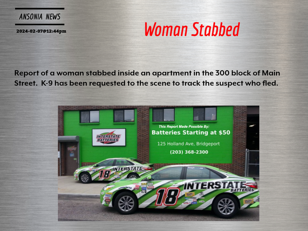 2024-02-07@12:44pm–#Ansonia CT– Report of a woman stabbed inside an apartment in the 300 block of Main Street.