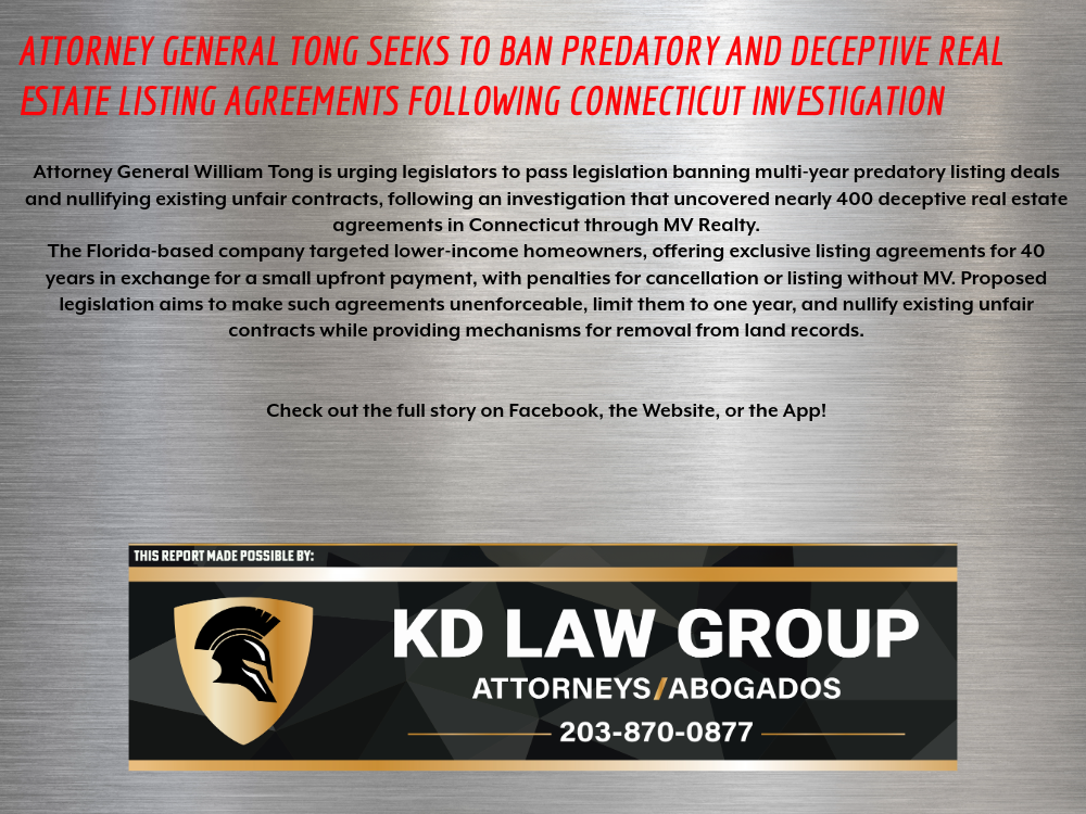 (Hartford, CT) – Following an investigation that uncovered nearly 400 deceptive real estate agreements in Connecticut through the company MV Realty, Attorney General William Tong today urged legislators to pass legislation banning the multi-year predatory listing deals and nullifying all existing unfair contracts.