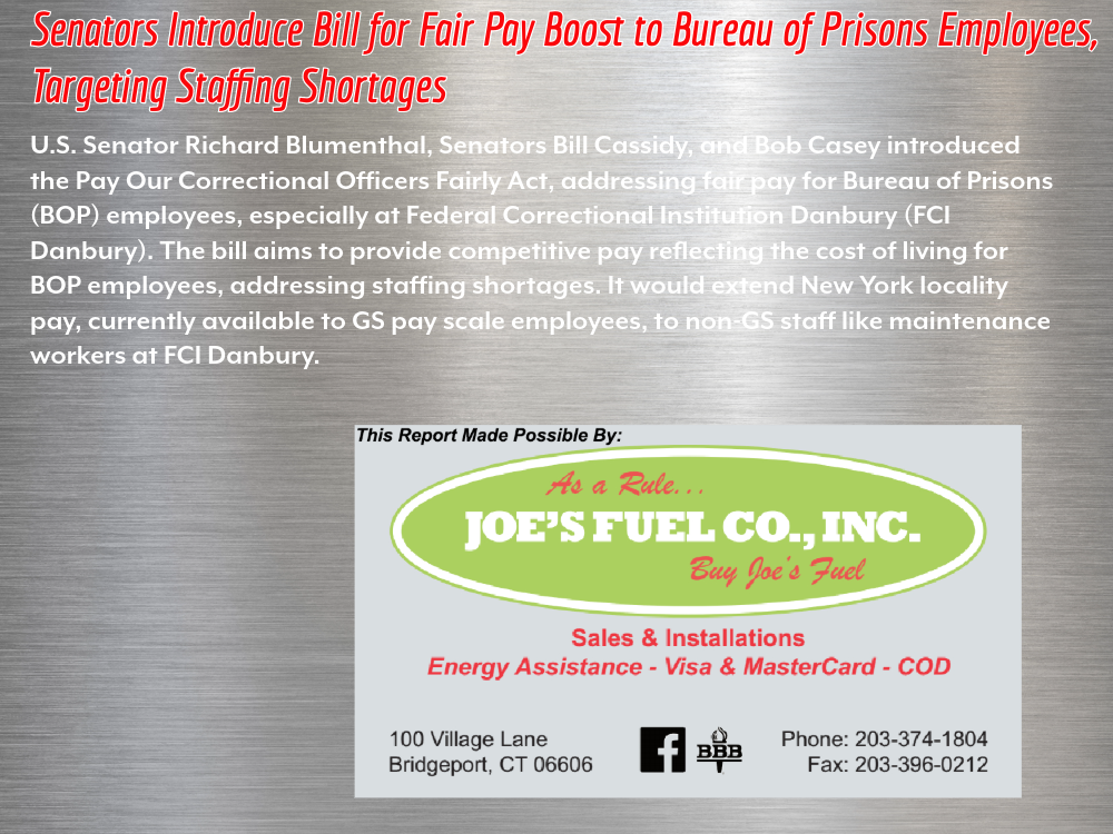“For years Bureau of Prisons employees in Connecticut have suffered from low wages, and unsustainable working conditions. All workers deserve fair treatment — not just for their sake, but in the public interest. Our bill would pay people fairly and competitively to improve conditions across FCI Danbury,” Blumenthal said.