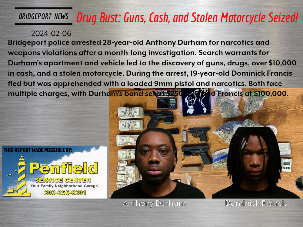 On February 7, 2024, officers working under the direction of Bridgeport Police Lieutenant Trevor Niestemski and Sergeant Michael Paoletti concluded a month-long investigation into 28-year-old Anthony Durham of Bridgeport CT for suspected narcotics and weapons violations. Search warrants were obtained for an apartment in the 200 block of Broad Street as well as a vehicle being used by Anthony Durham. Police officers located Durham inside his parked vehicle within the Charles F. Greene Homes Housing community.