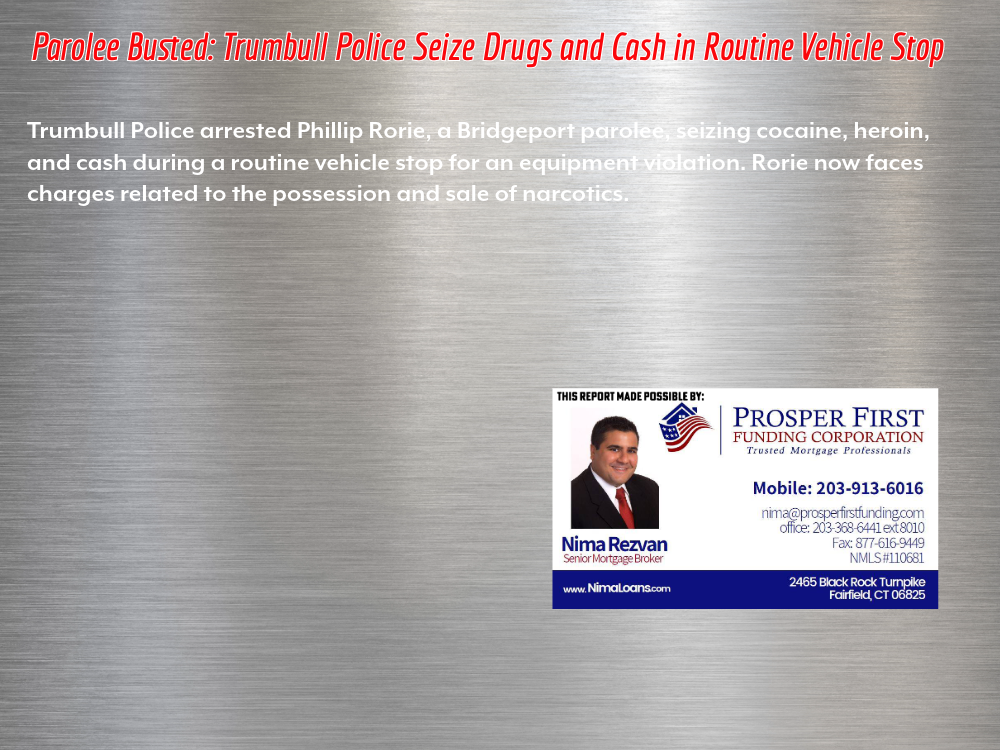 Trumbull Police recovered cocaine, heroin, and cash from a Bridgeport man who was out on parole after his vehicle was stopped for an equipment violation. The operator, Phillip Rorie, age 49, of Marigold Avenue, Bridgeport, was also found to have a small plastic bag containing a white rock-like substance, and over $1000 in cash in his possession.