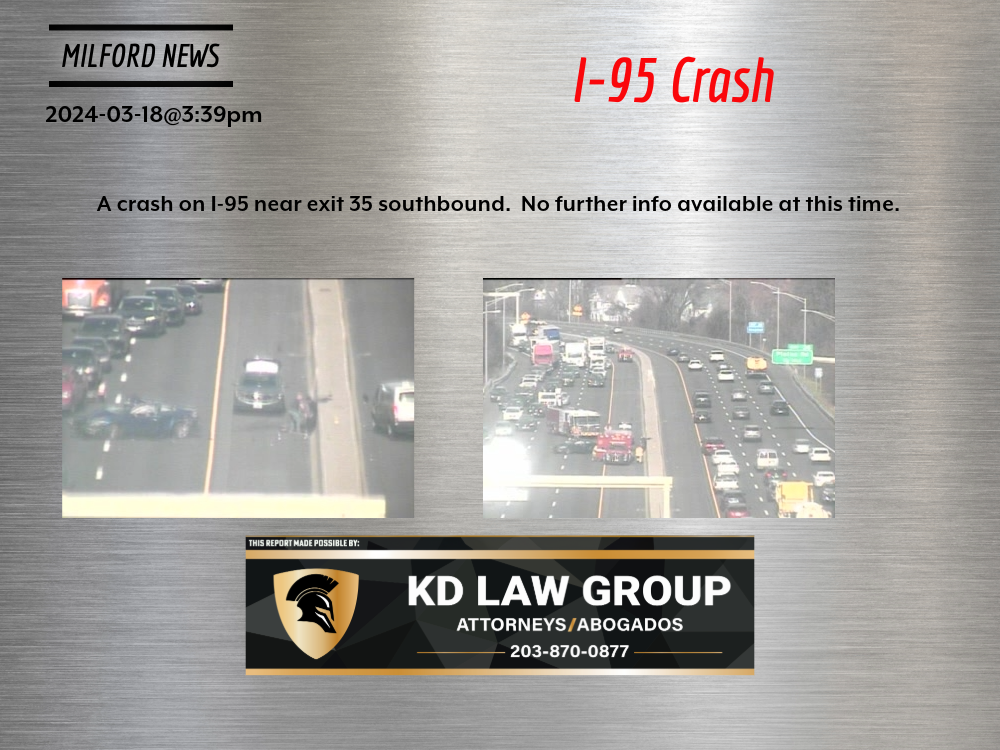 2024-03-18@3:39pm–#Milford CT– A crash on I-95 near exit 35 southbound. No further info available at this time.