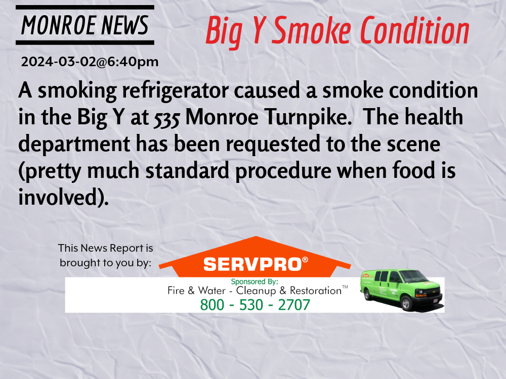 2024-03-02@6:40pm–#Monroe CT– A smoking refrigerator caused a smoke condition in the Big Y at 535 Monroe Turnpike. The health department has been requested to the scene (pretty much standard procedure when food is involved).