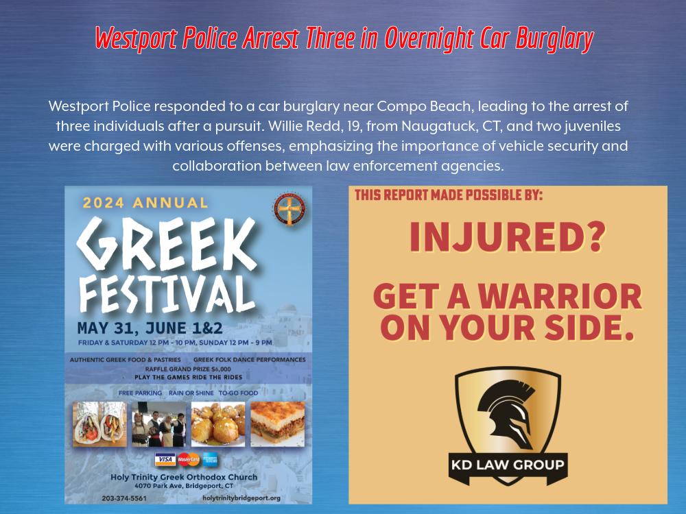 (Westport, CT) On March 26, 2024 at approximately 12:42 am, Westport Police responded to a residence near Compo Beach on a report from a homeowner that their vehicle was being burglarized.