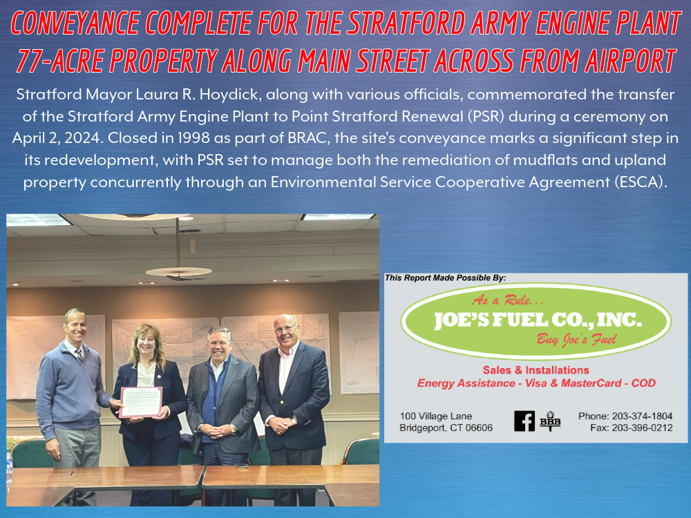 STRATFORD – On Tuesday, April 2, 2024, Stratford Mayor Laura R. Hoydick, Economic Development Director Mary Dean, Michael Reheuser, Director of Installation Services Office of the Deputy Chief of Staff, G-9 for the US Army along with several other Army officials, Greg Hencir from USACE (US Army Corps of Engineers), Ray Frigon from CT DEEP, and Jim Cabrera and Ted Lane from Point Stratford Renewal (PSR), held a ceremony to commemorate the recent conveyance of the Stratford Army Engine Plant from the Army and USACE to Point Stratford Renewal, the developers.