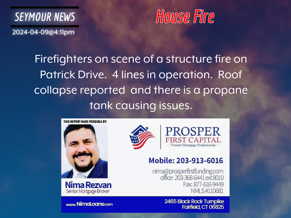 2024-04-09@4:11pm–#Seymour CT– ctfire–Firefighters on scene of a structure fire on Patrick Drive. 4 lines in operation. Roof collapse reported and there is a propane tank causing issues.