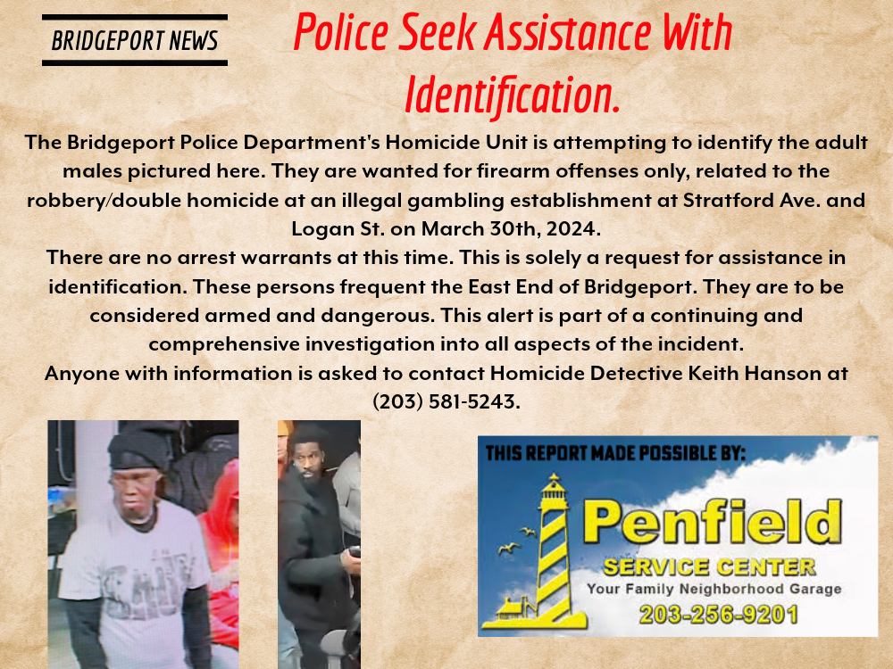 The Bridgeport Police Department’s Homicide Unit is attempting to identify the adult males pictured here. They are wanted for firearm offenses only, related to the robbery/double homicide at an illegal gambling establishment at Stratford Ave. and Logan St. on March 30th, 2024.