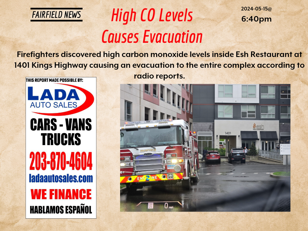 2024-05-15@6:40pm–#Fairfield CT– Firefighters discovered high carbon monoxide levels inside Esh Restaurant at 1401 Kings Highway causing an evacuation to the entire complex according to radio reports. I heard they (Esh) has really good food!