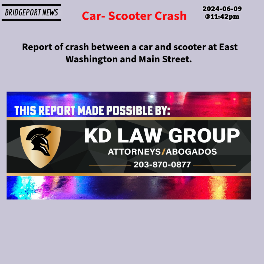 2024-06-09@11:42pm–#Bridgeport CT– Report of crash between a car and scooter at East Washington and Main Street.