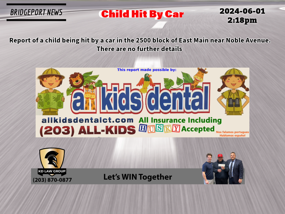 2024-06-01@2:18pm–#Bridgeport CT– Report of a child being hit by a car in the 2500 block of East Main near Noble Avenue. There are no further details