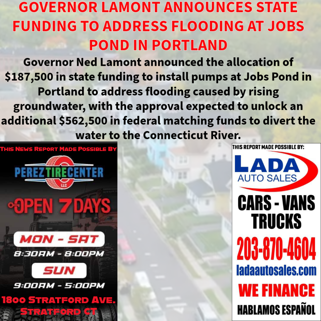 (HARTFORD, CT) – Governor Ned Lamont, who serves as chairman of the State Bond Commission, today announced that he has scheduled the commission to vote at an upcoming meeting on the approval of an allocation of $187,500 in state funding that will be used to install pumps at Jobs Pond in Portland to address an ongoing situation in which rising groundwater has been causing flooding in nearby neighborhoods.