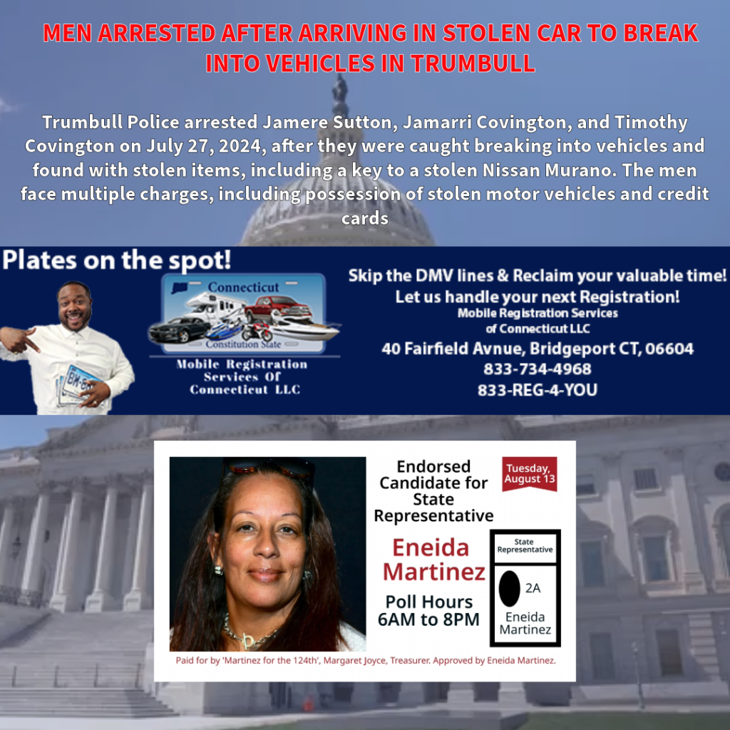 2 Trespass 3rd degree, Forgery 3rd degree, Possession of Stolen Credit Cards, Interfering with an Officer, Breach of peace, and Conspiracy to Commit Larceny of Motor Vehicle (3 counts). They were each held on a $20,000. Bond, and are scheduled to appear in Bridgeport Superior Court on August 5, 2024. Timothy was additionally charged with Possession of a Stolen License Plate, and Misuse of a License Plate. The Trumbull Police would also like to remind all residents of the continued thefts from unlocked motor vehicles, stolen vehicle complaints where keys are left inside, and stress the importance to ALWAYS LOCK YOUR VEHICLES, remove all packages and valuables, and never leave their keys inside.