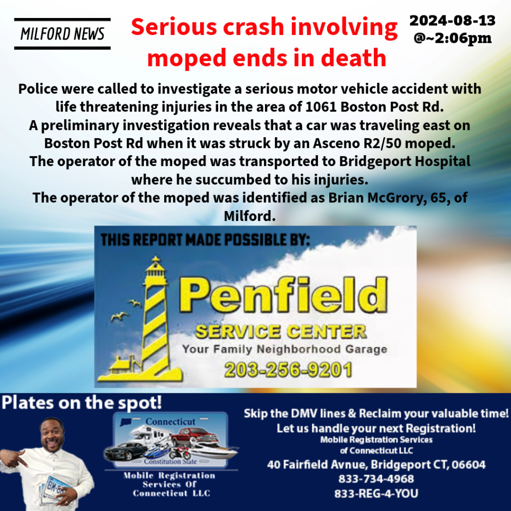 On August 13, 2024, at approximately 2:06PM, the Milford Police Department Traffic Division was called to investigate a serious motor vehicle accident with life threatening injuries in the area of 1061 Boston Post Rd. A preliminary investigation reveals that a car was traveling east on Boston Post Rd when it was struck by an Asceno R2/50 moped. The operator of the moped was transported to Bridgeport Hospital where he succumbed to his injuries. The operator of the moped was identified as Brian McGrory, 65, of Milford. If anyone has any additional information on this accident, please contact Milford Police Department at 203-878-4764.