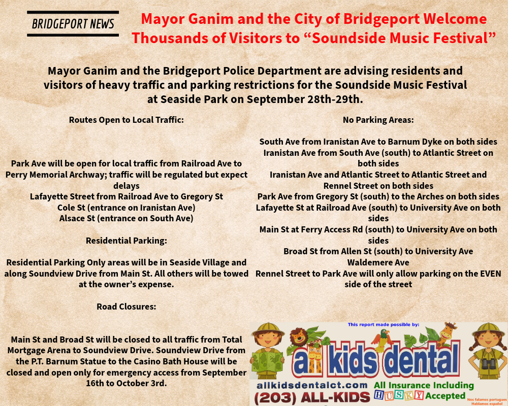 Bridgeport, CT –Mayor Ganim and the Bridgeport Police Department are advising residents and visitors of heavy traffic that is expected in the City’s Downtown and South End for the “Soundside Music Festival” which will be held at Seaside Park September 28th-29th. Residents who live near Seaside Park and the festivals access points are encouraged to plan accordingly. The City asks our community to be patient and understand that these traffic delays may occur along Iranistan Ave, South Ave, Barnum Dyke, and other areas for this historic event.