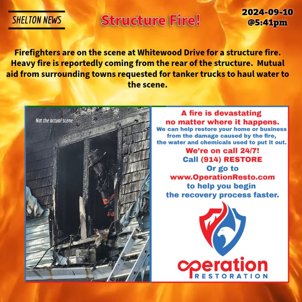 Firefighters are on the scene at Whitewood Drive for a structure fire. Heavy fire is reportedly coming from the rear of the structure. Mutual aid from surrounding towns requested for tanker trucks to haul water to the scene.