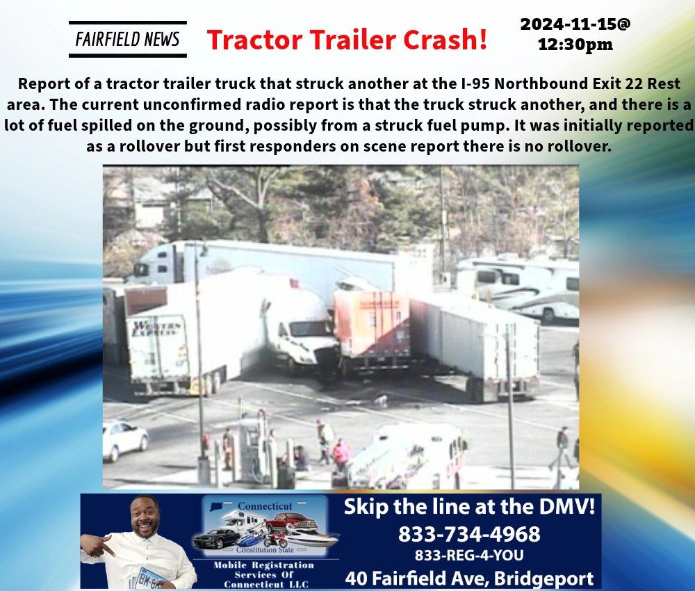 Report of a tractor trailer truck that struck another at the I-95 Northbound Exit 22 Rest area. The current unconfirmed radio report is that the truck struck another, and there is a lot of fuel spilled on the ground, possibly from a struck fuel pump. It was initially reported as a rollover but first responders on scene report there is no rollover.