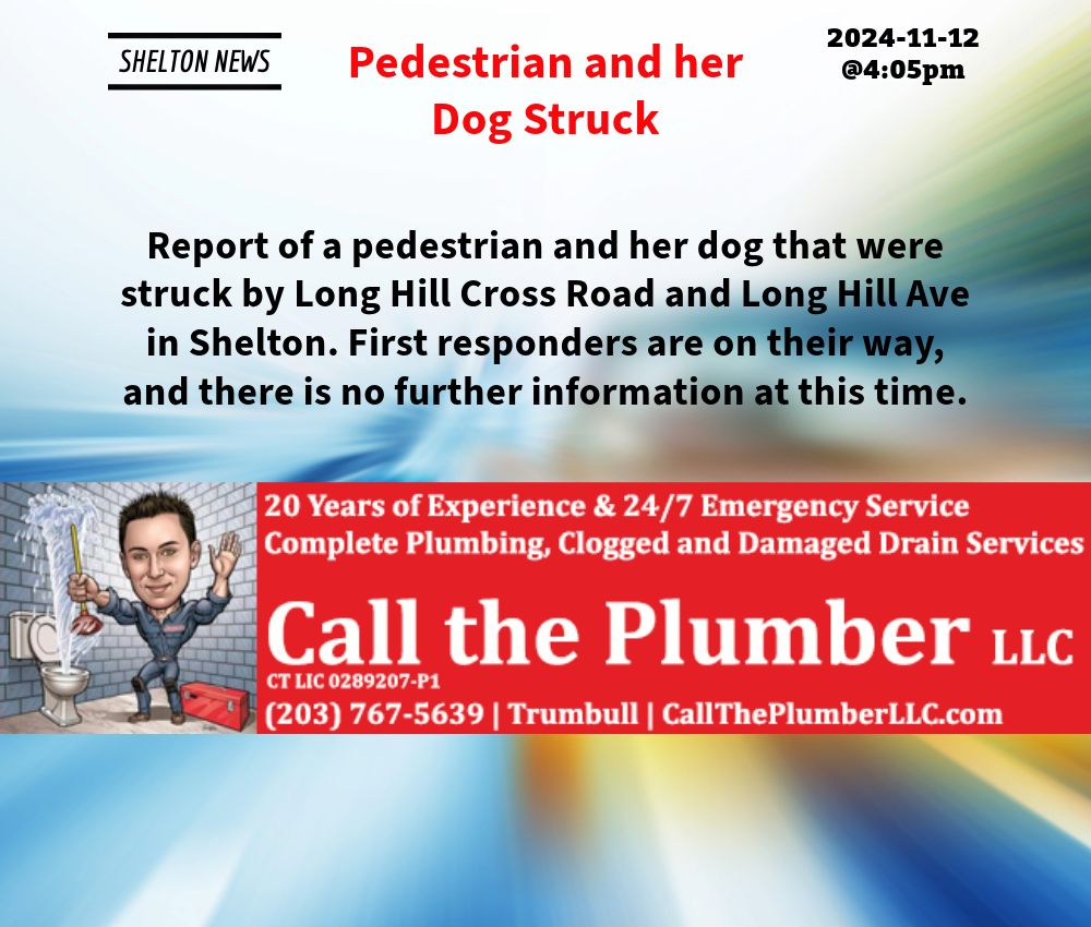 Report of a pedestrian and her dog that were struck by Long Hill Cross Road and Long Hill Ave in Shelton. First responders are on their way, and there is no further information at this time.
