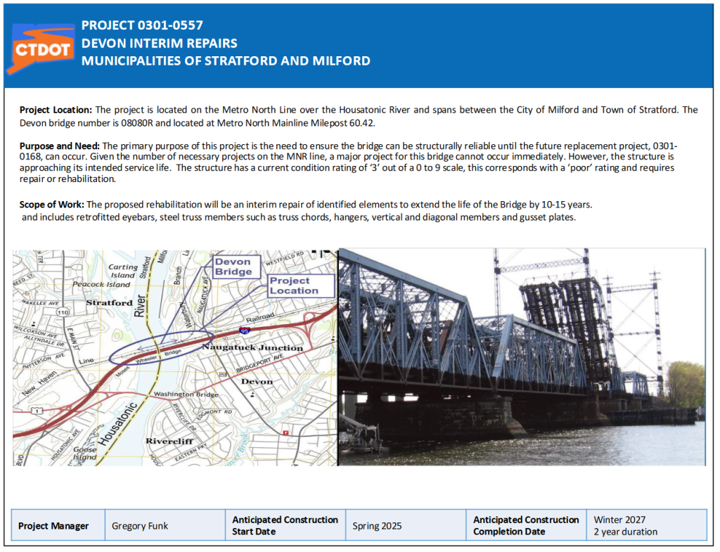 The primary purpose of this project is to provide safety and operations improvements to the Devon Railroad Bridge, which carries one of the most popular rail lines in the U.S. Extending its service life will also lead to the construction of the future Devon Bridge Replacement Project..