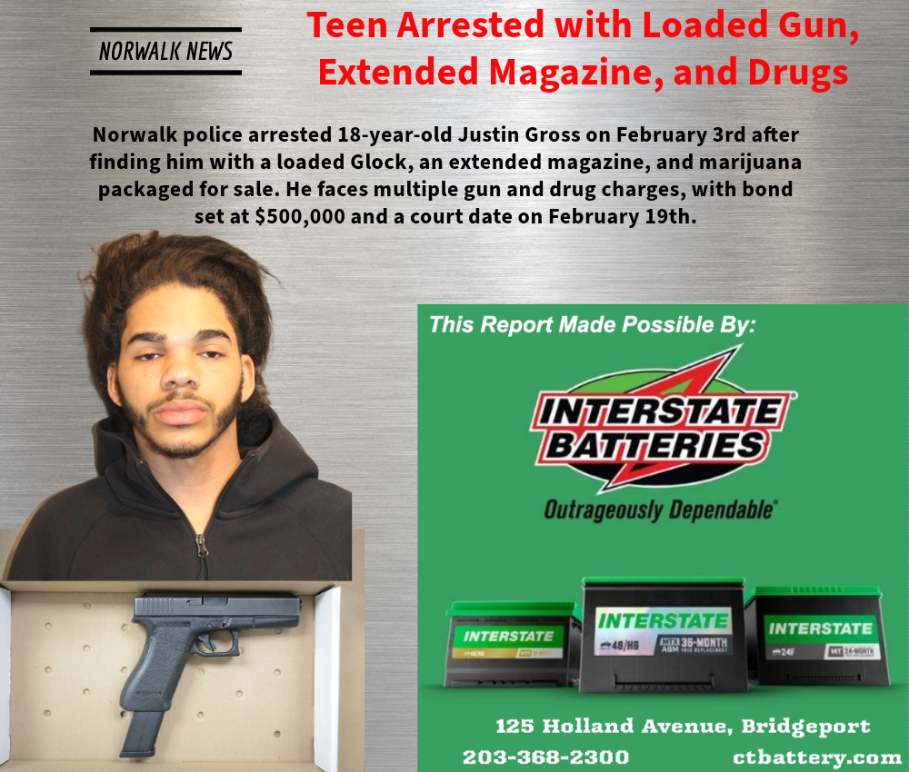Norwalk police arrested 18-year-old Justin Gross on February 3rd after finding him in possession of a loaded Glock with an extended magazine and marijuana packaged for sale. Detectives had a search warrant for Gross as part of an ongoing investigation. When officers spotted him on Connecticut Avenue around 6:00 PM, he attempted to flee by crossing four lanes of traffic but complied when ordered to stop.