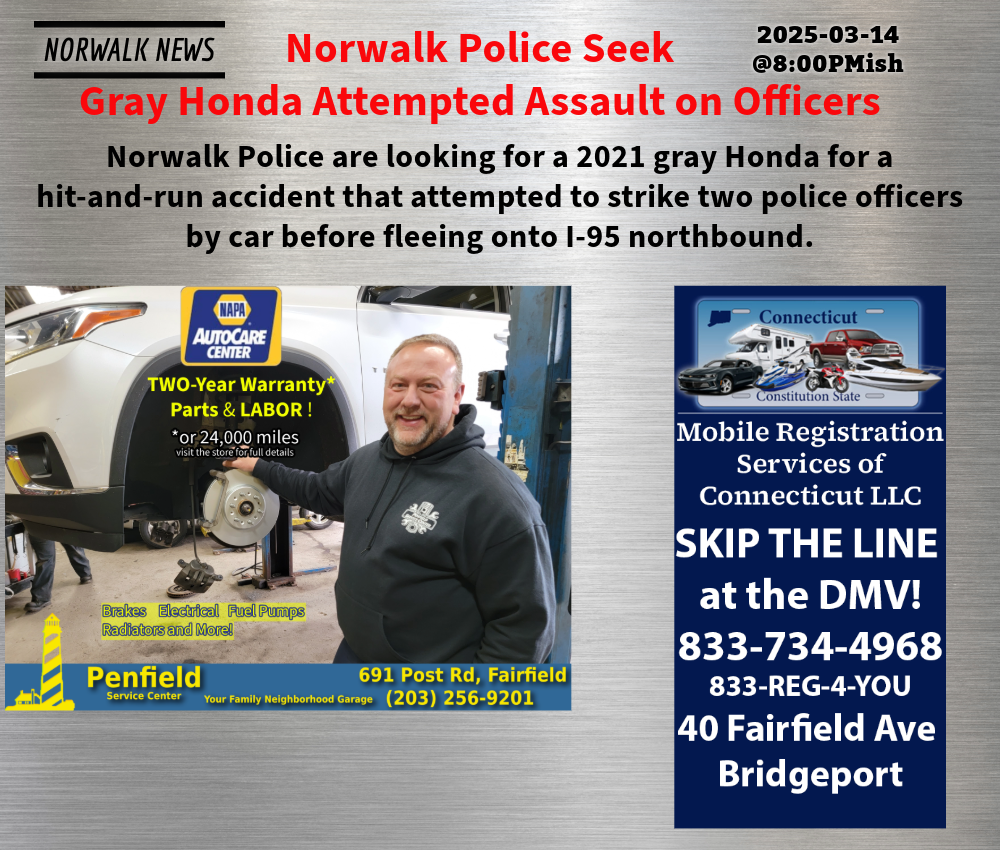 Norwalk Police are looking for a 2021 gray Honda for a hit-and-run accident that attempted to strike two police officers by car before fleeing onto I-95 northbound.