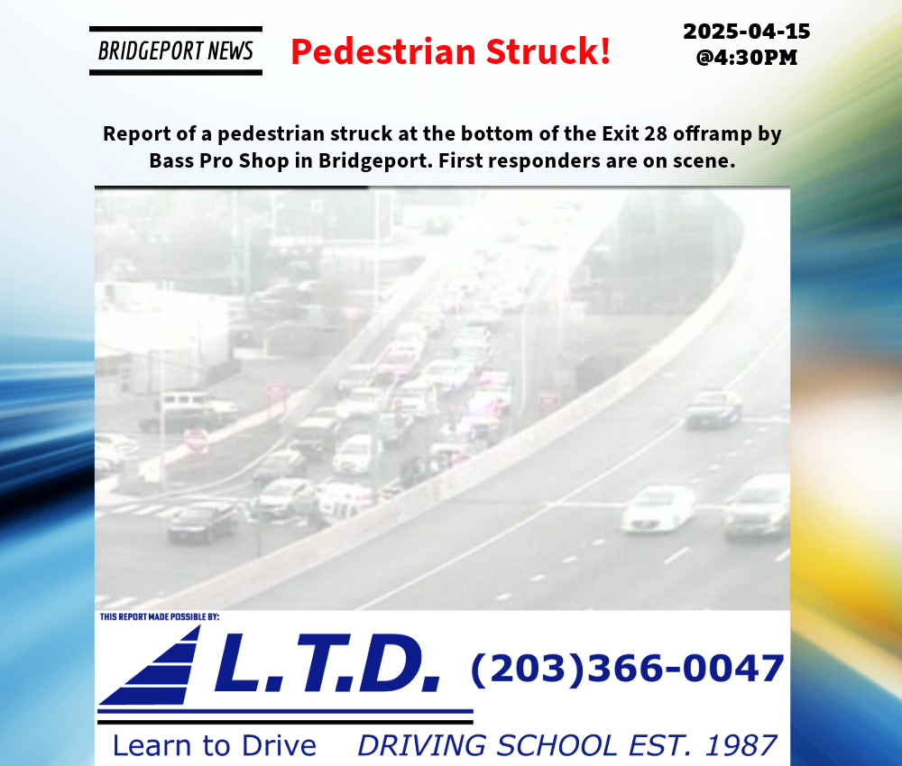 Report of a pedestrian struck at the bottom of the Exit 28 off ramp on I-95 by Bass Pro Shop in Bridgeport. First responders are on scene.