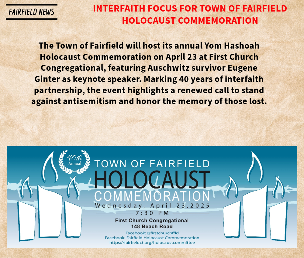 Marking a 40-year commitment to interfaith unity, the Town of Fairfield will commemorate the Holocaust by welcoming survivor Eugene Ginter to speak at its annual Yom Hashoah observance on Wednesday, April 23 at First Church Congregational.