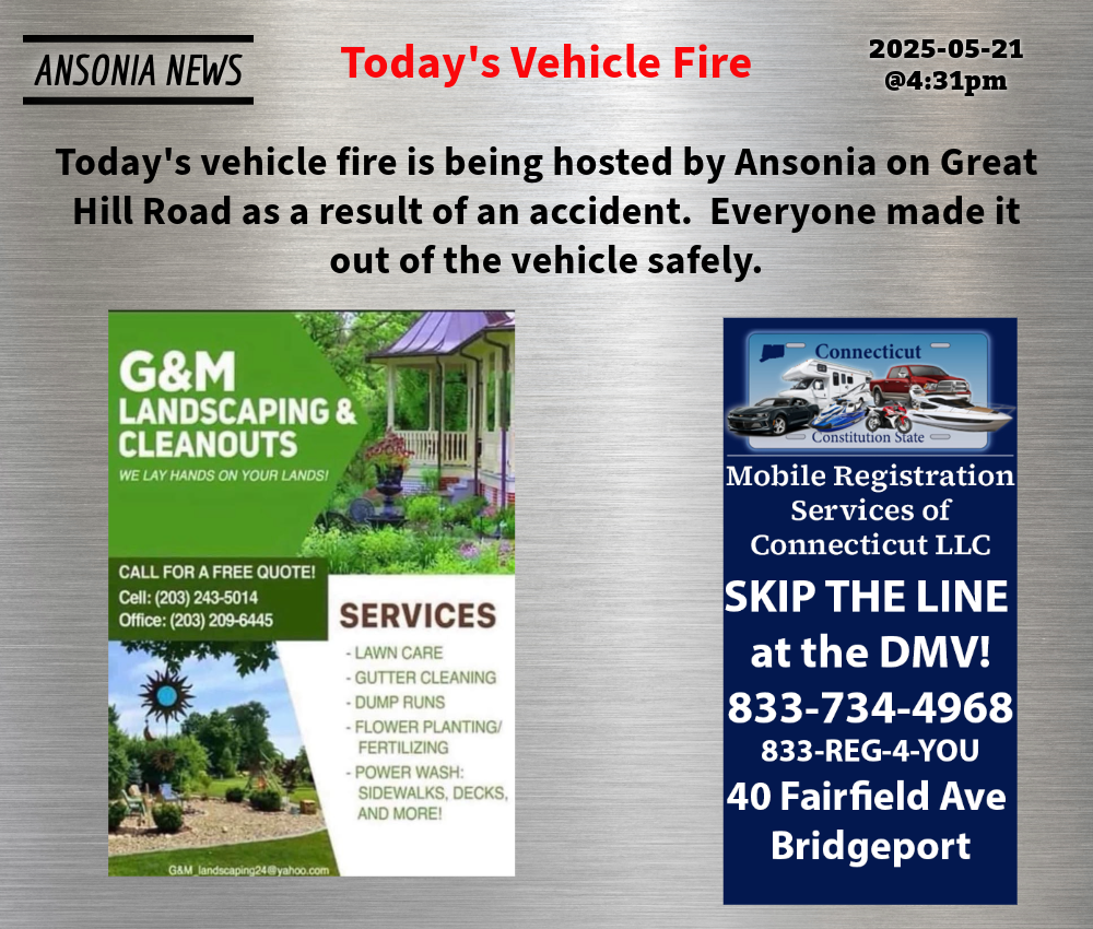 Today’s vehicle fire is being hosted by Ansonia on Great Hill Road as a result of an accident. Everyone made it out of the vehicle safely.