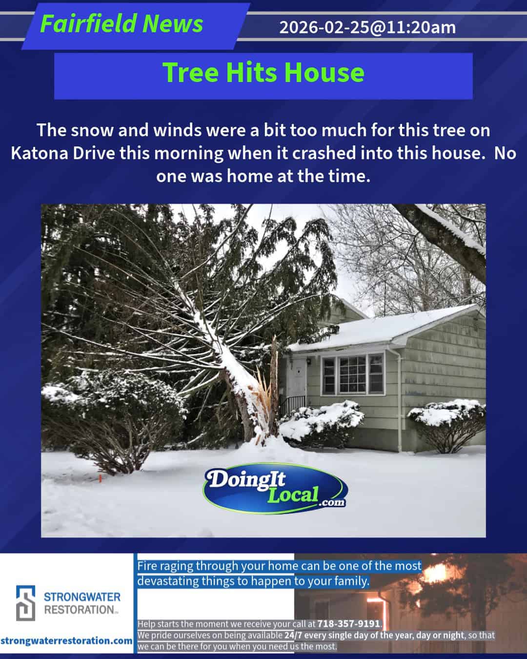 The snow and winds were a bit too much for this tree on Katona Drive this morning when it crashed into this house. No one was home at the time. 2026-02-25@11:20am