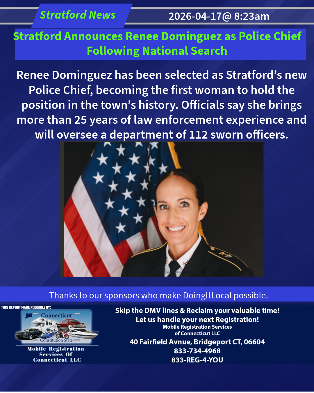 STRATFORD, CT – Today, Mayor David Chess announced that Renee Dominguez has been selected as Stratford’s new Police Chief. Chief Dominguez will oversee a 112 sworn officer department and help guide the future of public safety and community policing in the town of more than 52,000 residents and will also be the first female police chief in Stratford’s history. “I am thrilled to appoint Renee Dominguez as our next Police Chief,” said Mayor Chess. She brings over 25 years of valuable experience serving in three police departments across Connecticut, where she rose through the ranks and became a respected leader with deep knowledge of law enforcement. She is fully prepared to lead the dedicated men and women who serve and…